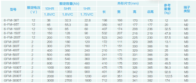 在20℃環(huán)境下,F(xiàn)M系列小型密封電池浮充壽命可達(dá)3~5年,F(xiàn)M固定型密封電池浮充壽命可達(dá)8~10年,F(xiàn)ML系列電池浮充壽命可達(dá)10年,F(xiàn)MH系列電池浮充壽命可達(dá)10年,GFM系列、太陽能深循環(huán)系列電池浮充壽命可達(dá)15年,GFMJ系列電池浮充壽命可達(dá)18年。